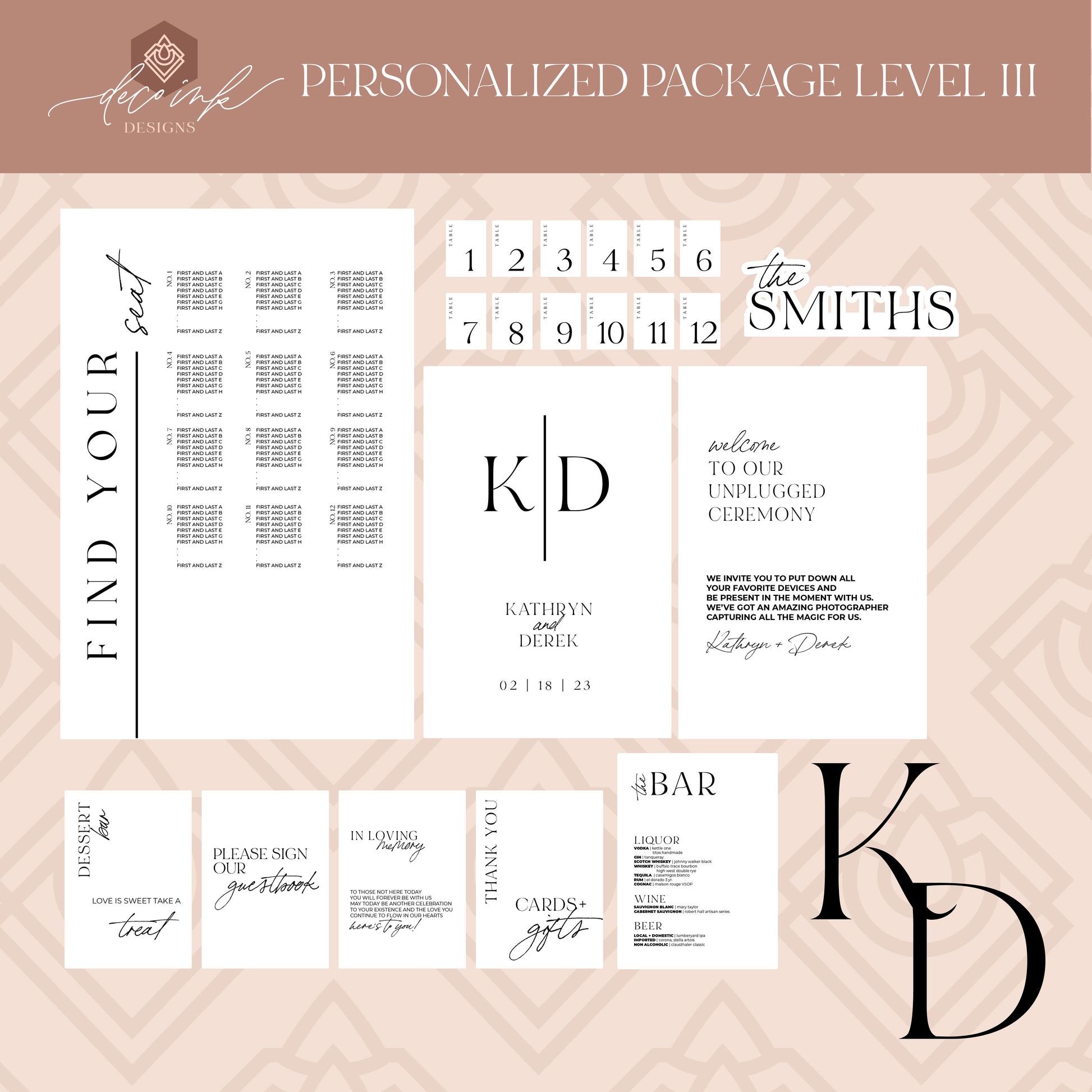 Design: What you see if what you get! Of course, we will add your details and gather all the information we need to swap out but as far as fonts go and placement of lettering, it all stays. In order to keep the cost where it is, we can delete a design element you do not like but we cannot add anything to these pre-designed packages.
